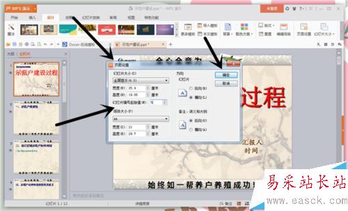 5、彈出一個(gè)“頁面設(shè)置”的對(duì)話框,我們找到“幻燈片編號(hào)起始值”,然后在后面輸入合適的數(shù)值,也就是承接上一個(gè)PPT里幻燈片的數(shù)值,點(diǎn)擊“確定”即可。