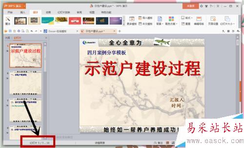 2、打開我們自己的PPT頁面,我們會(huì)發(fā)現(xiàn)我們自己的PPT起始值是從1開始的,然后也會(huì)顯示總歸有多少頁幻燈片,我們要做的就是對(duì)起始頁進(jìn)行修改。