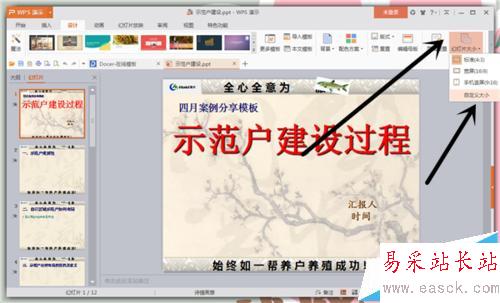 3、我們找到工具欄中的“設(shè)計(jì)”--“幻燈片大小”。“幻燈片大小”右下側(cè)有一個(gè)“小三角”,點(diǎn)擊那個(gè)“小三角”。
