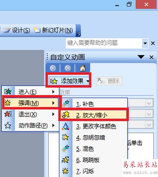 2、選中文本框,點(diǎn)擊右側(cè)自定義動(dòng)畫(huà)欄中的“添加效果”,在彈出框中選擇“強(qiáng)調(diào)——放大/縮小”。