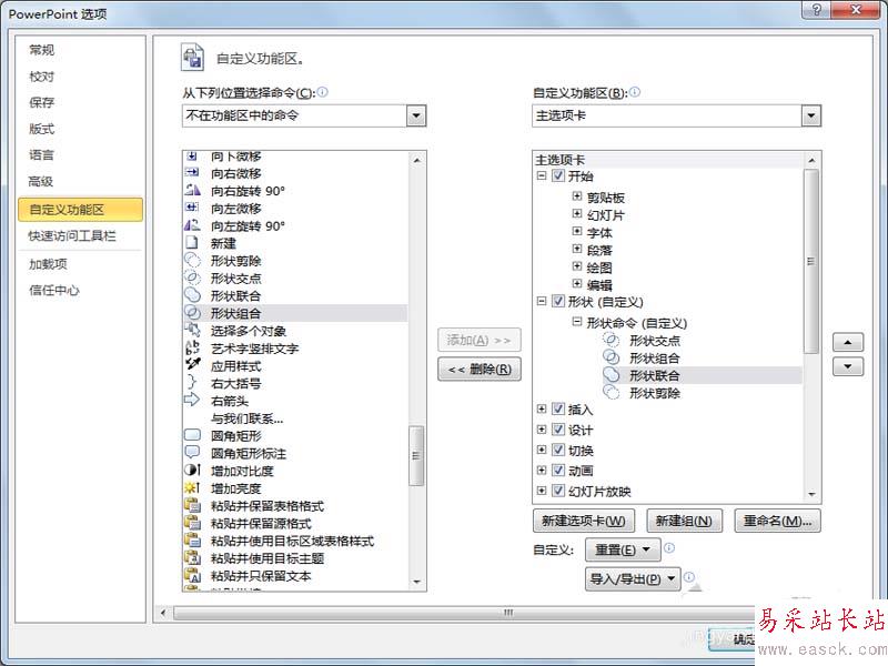 6、接著從下面選擇列表中選擇形狀聯合,形狀剪除等四個命令拖拽到剛才新建的形狀命令組即可,點擊確定。