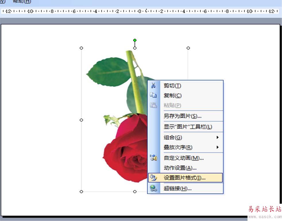 1、找到設置圖片格式工具。具體做法:選中圖片,右擊鼠標,在彈出框里選擇“設置圖片格式”,調出設置圖片格式的工具。