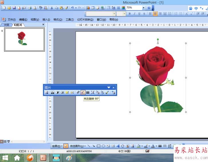 在ppt中,如果插入的圖片倒置,怎樣把它調整過來呢?有兩種方法。最簡單的方法,利用圖片工具欄,點擊旋轉按鈕調整圖片。第二種方法,利用圖片格式,設置圖片旋轉的角度。