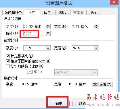 3、調整圖片的角度。點擊旋轉右側的向上的小箭頭,直到數字變成180°為止(也可以選中原有的0°,輸入180°),然后點擊確定,圖片就會自動調整成正放的樣子。