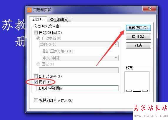5、然后,清除文本內容或者不理文本內容直接把頁腳前面的勾去掉,這樣就不會顯示頁腳了,單擊全部應用,就可以在所有幻燈片上清除頁腳內容了。