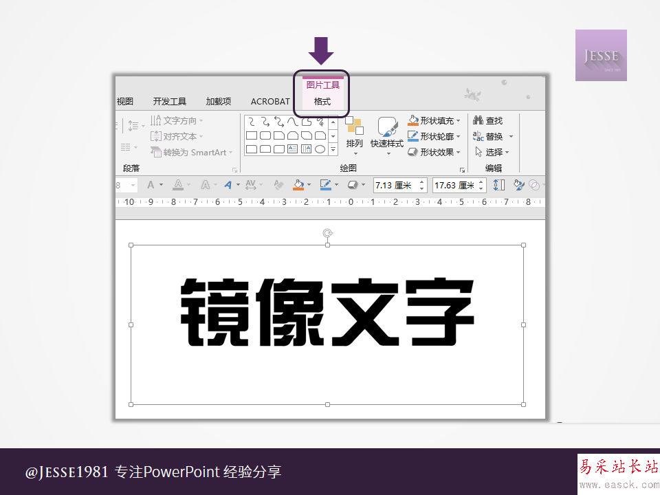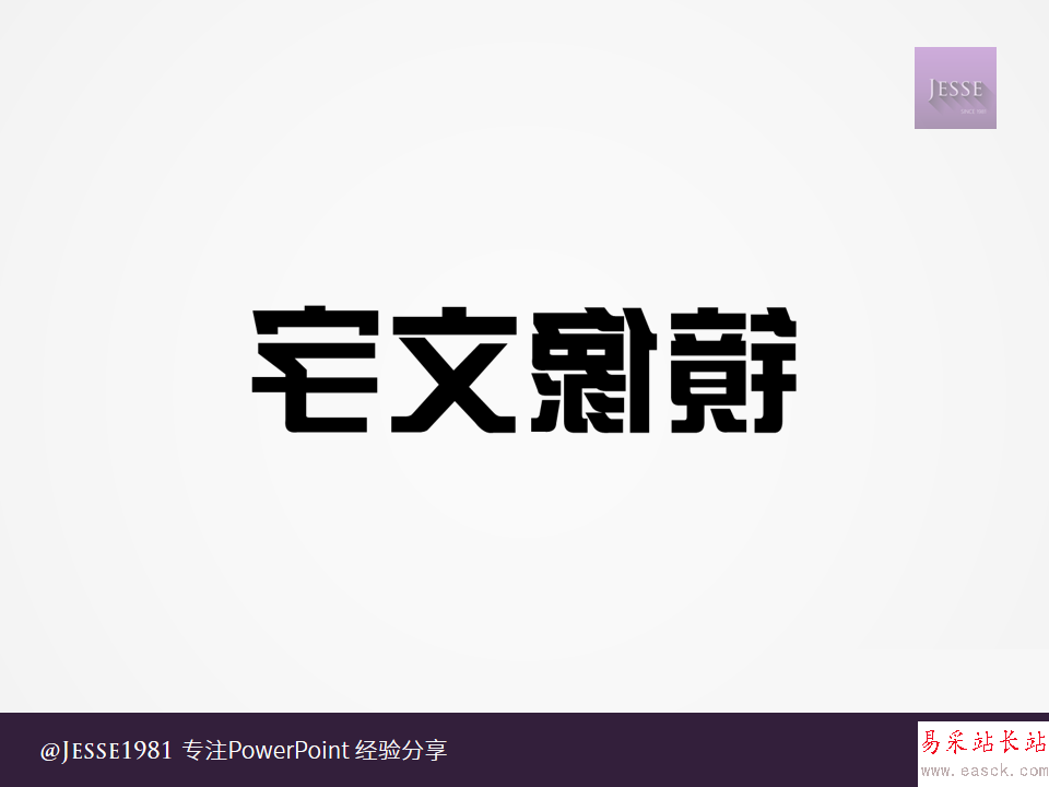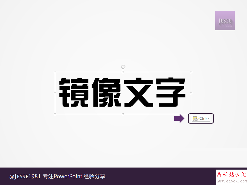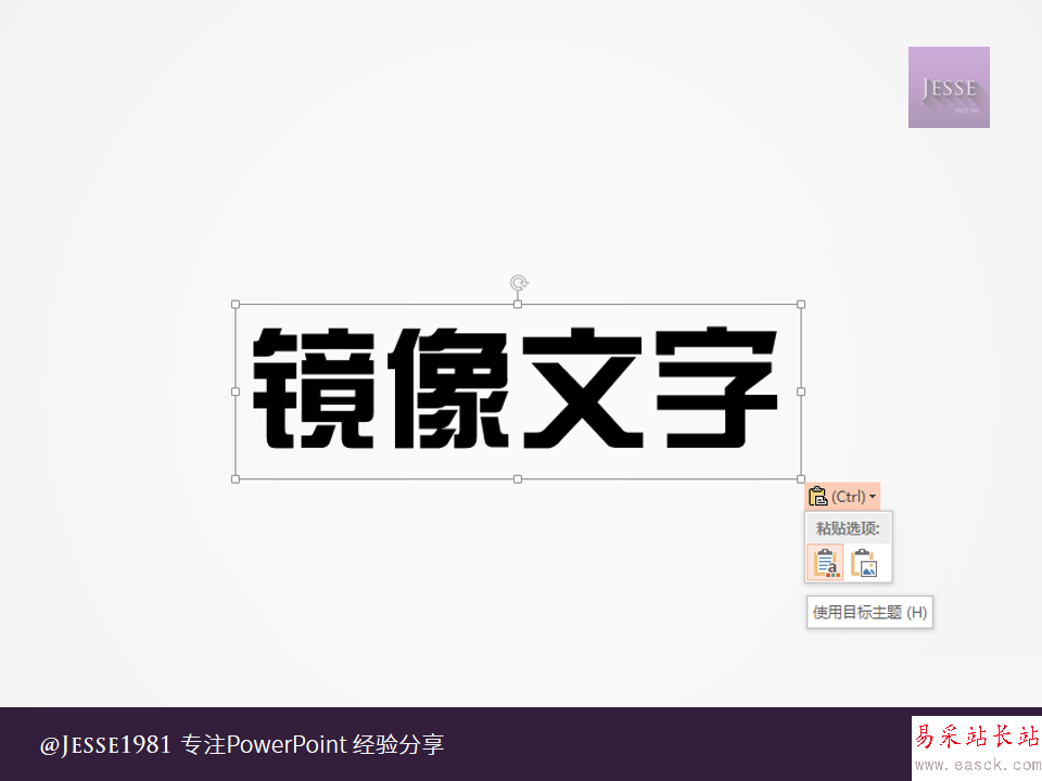 使用文字效果中的鏡像,并不能得到完整的鏡像,且鏡像只能垂直向下方。而左右鏡像文字,是指文字完全成鏡像展現,不光只是順序變為從右往左讀,就連筆畫結構都完全成鏡像。這在制作一些PPT封面時可以起到很強的裝飾作用。