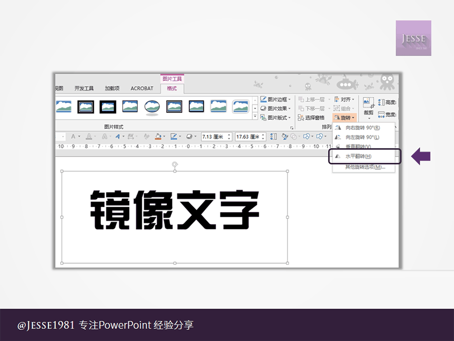 6、進入“圖片工具-格式”選項卡,選擇工具欄右側的“旋轉-水平翻轉”
