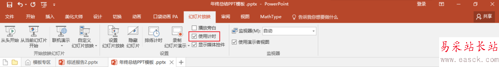 3、還是在【幻燈片放映】選項欄,勾選“使用計時”。以上三步必須設置,否則無法自動切換。