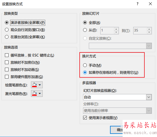 2、然后將該選項下的“換片方式”設置成“如果存在排練時間,則使用它”,確定后退出
