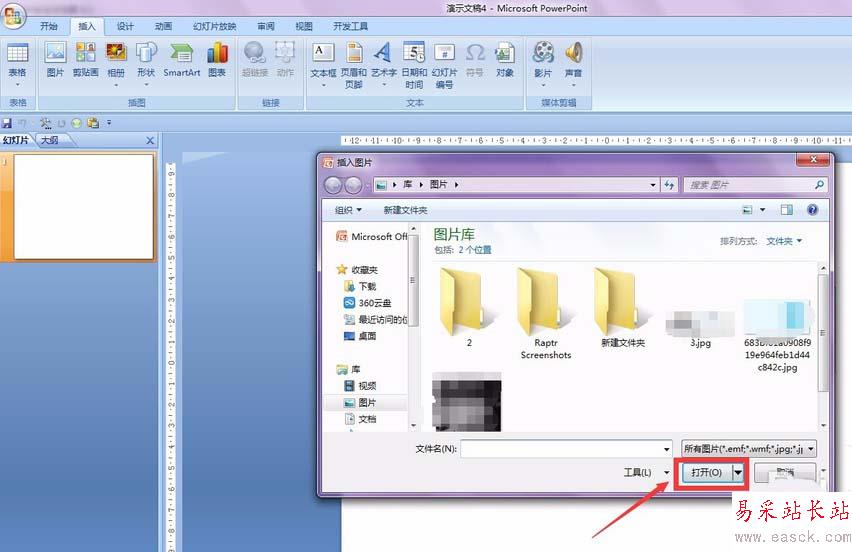 3、一般操作方法是在插入圖片的對話框中選擇圖片所在位置的路徑,然后點打開。但是這樣插入的圖片如果原圖修改的話PPT中的是沒有任何變化的。