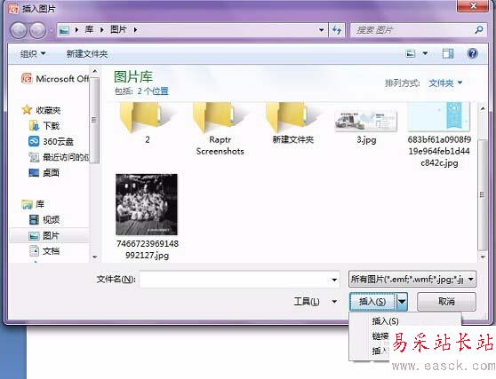 5、在下拉菜單中有“插入、鏈接到文件、插入和鏈接”,在這里我們要選擇“鏈接到文件”,如圖所示。