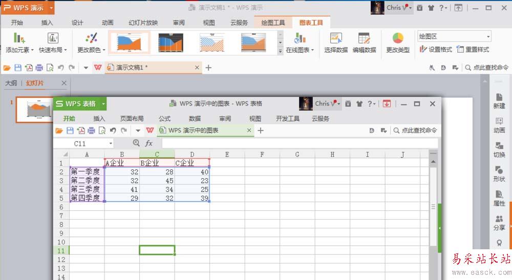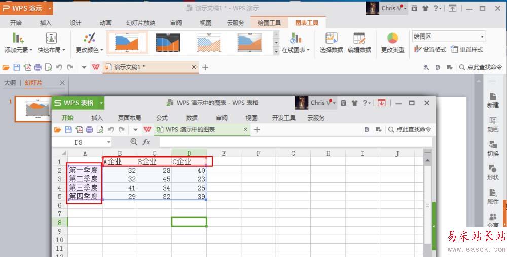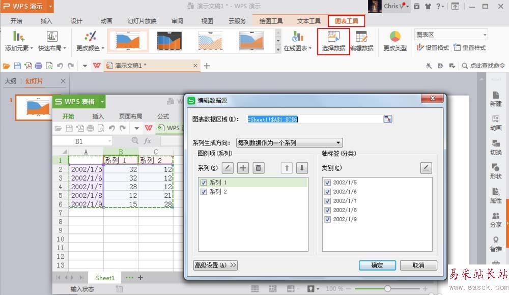 4、選擇了合適的圖表,接著我們就要根據(jù)我們的數(shù)據(jù)進(jìn)行輸入了,點(diǎn)擊菜單欄“圖表工具”——“選擇數(shù)據(jù)”,點(diǎn)擊后彈出“編輯數(shù)據(jù)源”對(duì)話(huà)框及“WPS演示中的圖表”;