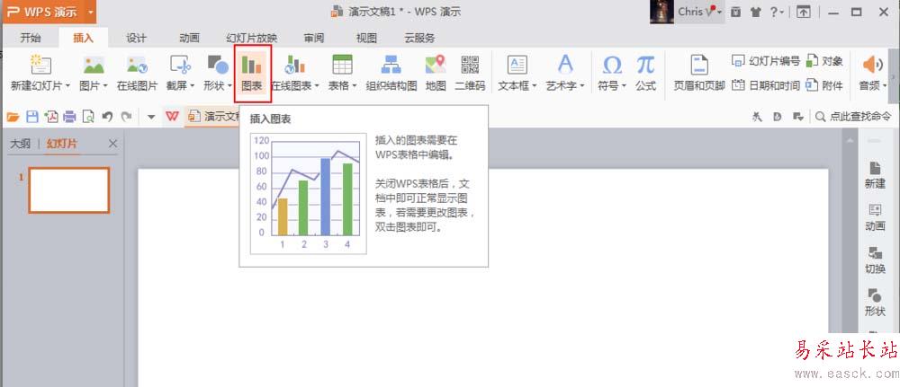 1、說(shuō)明下我用的是WPSppt辦公軟件,首先新建一個(gè)空白的演示文稿,當(dāng)然你也可以在現(xiàn)有的ppt上操作,或是在需要添加圖表的ppt里新建個(gè)幻燈片進(jìn)行操作都可;
