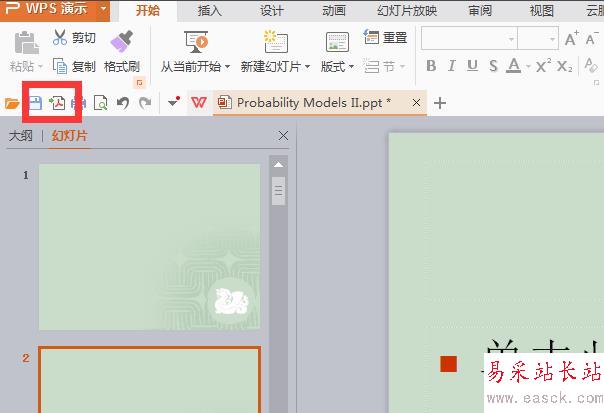 2、打開PPT之后我們在上面的功能區(qū)可以看到的是很多東西我們,在保存的圖片邊上有個PDF標志的圖片,我們點擊一下就可以的。
