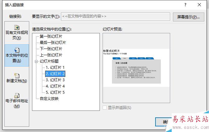 右擊這個近乎透明的矩形塊,從右鍵菜單中選擇“超鏈接”,在彈出的插入超鏈接對話框中,最左側選中“本文檔中的位置”,再在中間欄選擇對應此標簽的“幻燈片2”。