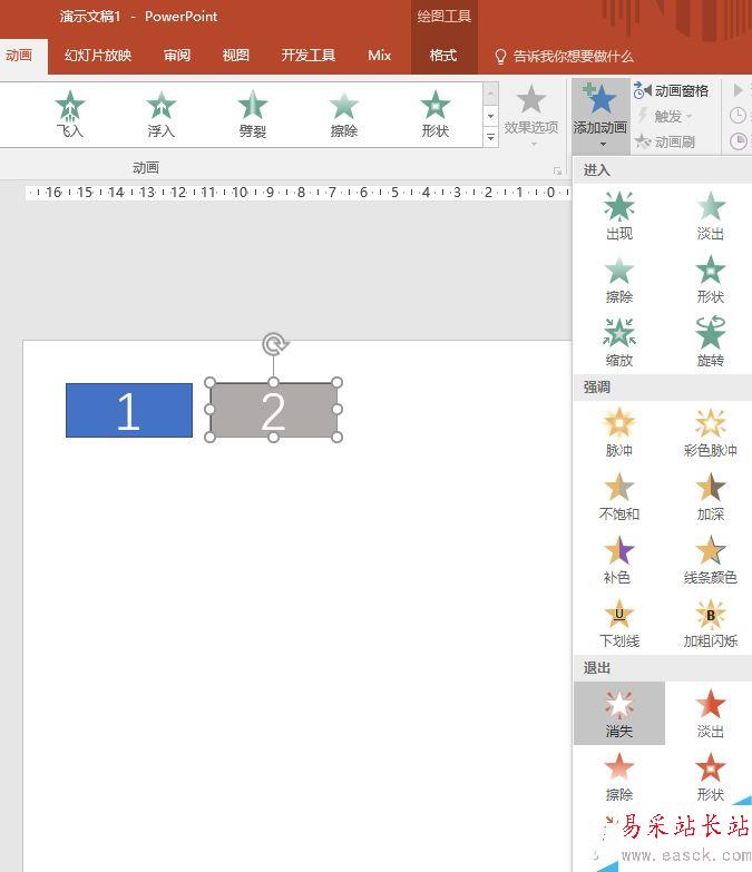 現在選中灰色的矩形,然后切換到“動畫”選項卡,點擊“添加動畫”,從彈出框中選擇“退出”中的“消失”。
