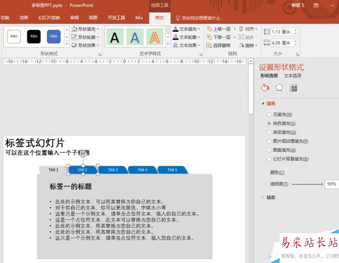 回到標簽1的幻燈片中,然后切換到PowerPoint的“插入”選項卡,點擊“形狀”,選擇繪制一個矩形塊,覆蓋住標簽2的圖標。右擊此矩形塊,選擇“設置形狀格式”,在右側打開設置窗格,將“透明度”設置為99%,這時將幾乎看不到這個覆蓋的矩形塊了。