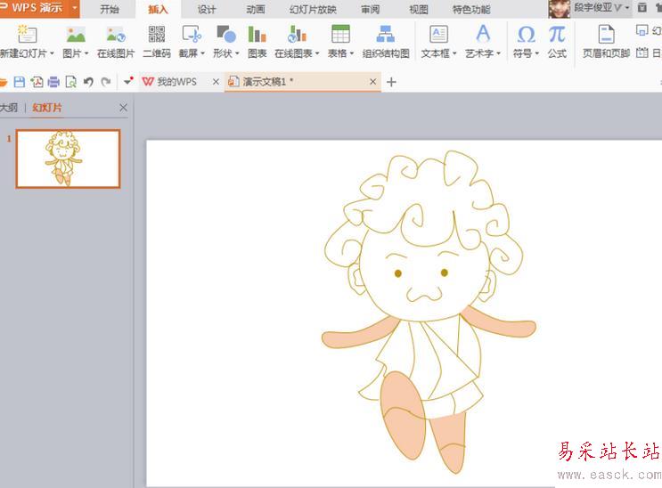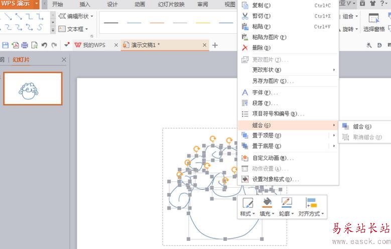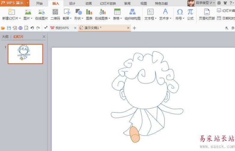 4、然后整體框選圖形,鼠標右鍵進行組合,選擇S形狀,繪制人物的耳朵,將耳朵輪廓的顏色設置為藍色,如圖