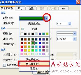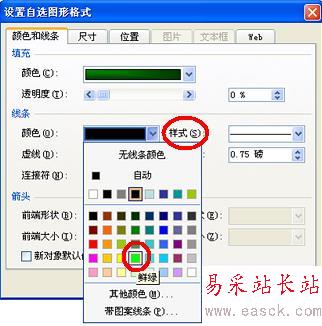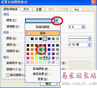 5、在設置自選圖形選項卡中,設置圖形的顏色。點擊右側的小箭頭,選擇喜歡的顏色,我選了綠色。