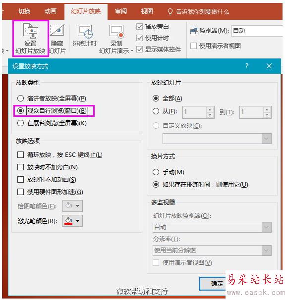 2 如果你要實現窗口化預覽,可以在【幻燈片放映】選項卡>【設置幻燈片放映】的放映類型中,選擇【觀眾自行瀏覽(窗口)】。