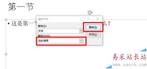 4、比如我們選擇替換為“微軟雅黑”,選中,點(diǎn)擊“替換”