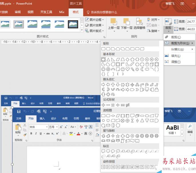 接下來制作圖片Word的“開始”標簽放大圖。點選第2張幻燈片,然后將該幻燈片中的圖片復制一份并適當放大,再然后切換到“圖片工具-格式”選項卡,點擊工具欄上的“裁剪”下拉按鈕,選擇“裁剪為形狀”下面的圓形。