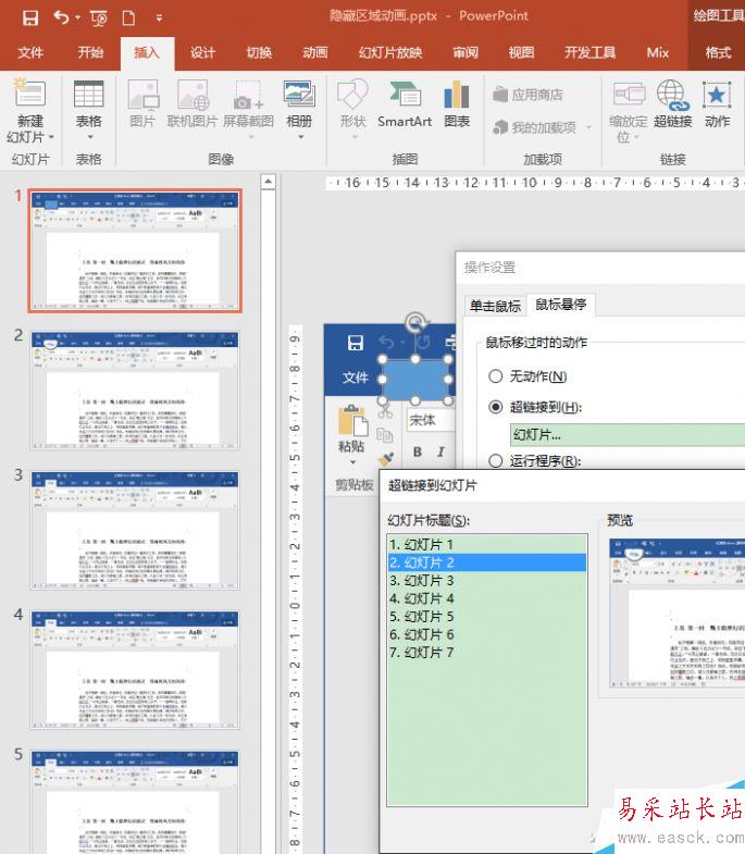 現在我們回到第1張幻燈片中,切換到“插入”選項卡,插入一個形狀繪制出矩形將圖片Word中的“開始”的位置圈住。然后再點擊工具欄上的“動作”按鈕,調出操作設置窗口,切換到“鼠標懸停”,選中“超鏈接到”,并在下面選擇超鏈接到“幻燈片”,又會打開一個窗口,選擇“幻燈片2”,即剛才制作有放大鏡的那張幻燈片。