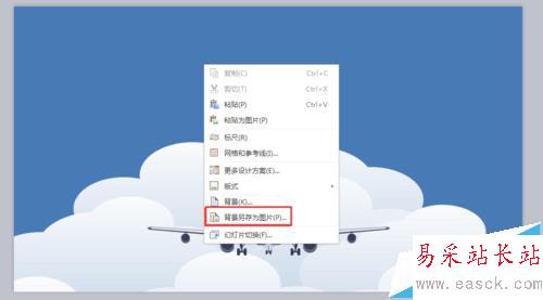 2、在要復(fù)制背景的幻燈片上點擊鼠標(biāo)右鍵彈出下來菜單,在下拉菜單里找到【背景另存為圖片】選項,如下圖所示。