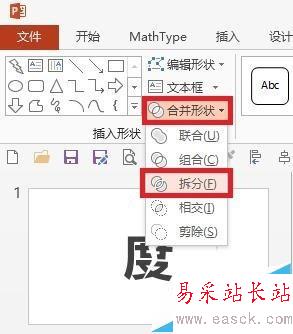 4、先選擇文字,再按住shift鍵選擇閃電形狀,點擊格式,插入形狀,合并形狀,拆分。