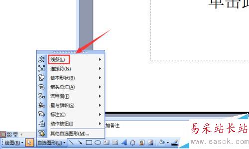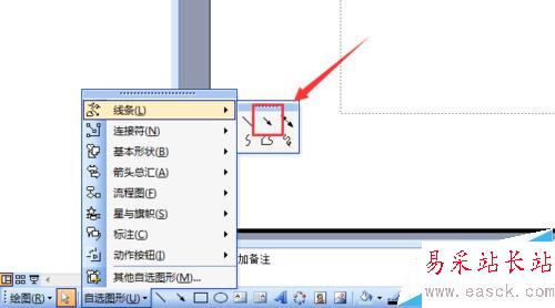 4、點擊自選圖形選項,在其子級菜單里找到線條選項,如圖所示: