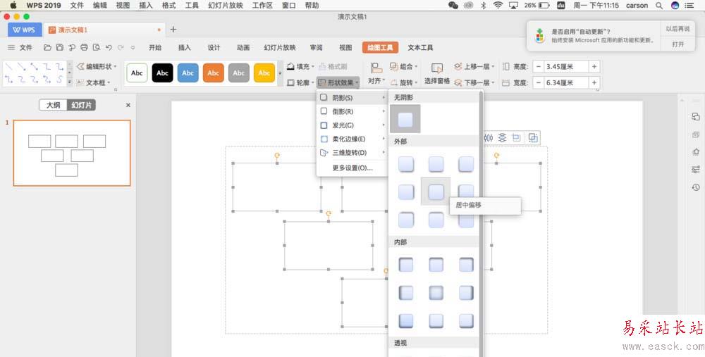 3、再次選中矩形,按住shift和Ctrl鍵,水平復制矩形出來,復制多少按照自己的實際情況。選中所有,在形狀效果中點擊陰影效果,為當前選中的所有矩形設置一個居中偏移的陰影效果