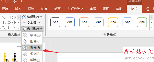 4、調(diào)整后我們首先點(diǎn)擊文字,然后選擇矩形框,選擇格式中合并形狀菜單中的拆分。