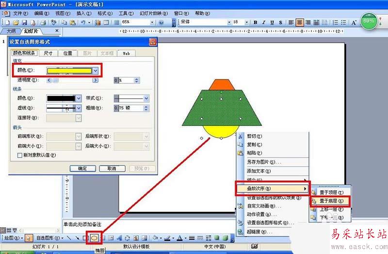 5、在繪圖工具欄那里選擇橢圓——按住shift鍵畫一個圓形——右擊圓形——疊放秩序——置于底層——雙擊圓形——填充黃色顏色。把圓形移動讓梯形遮住一半,留一個弧形形狀,當作燈泡。