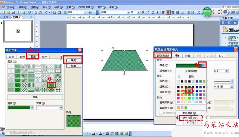 3、雙擊梯形——顏色和線條——在填充那里先選擇綠色——接著再次在填充那里選擇——填充效果——圖案,選擇一種圖案——確定——點擊確定。