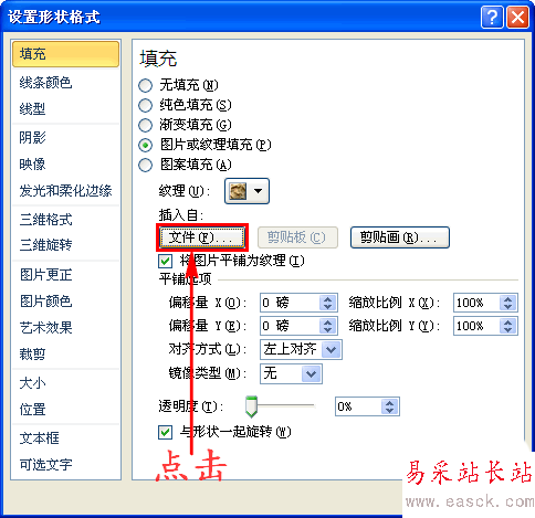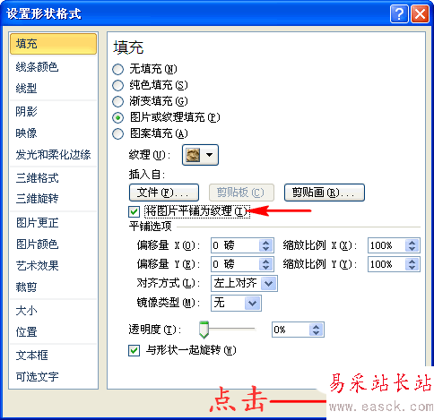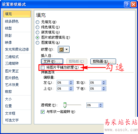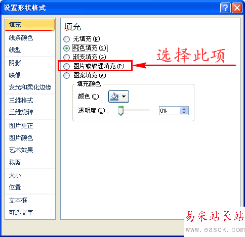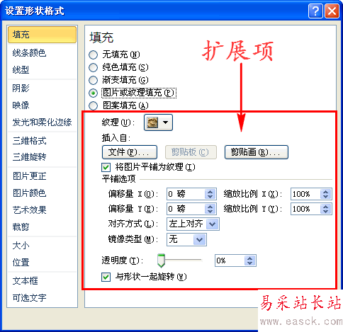 3、然后在對話窗的“填充”界面中我們選擇“圖片或紋理填充”選項,這樣就會出現(xiàn)擴(kuò)展項。如圖所示: