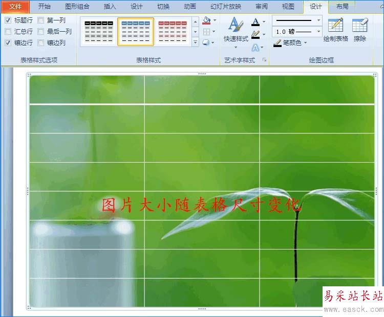 6、隨著表格尺寸的改變,添加的圖片大小也會隨之改變。如圖所示:
