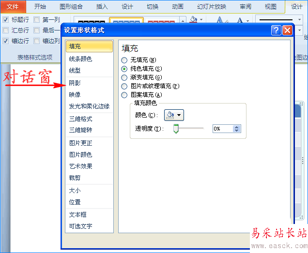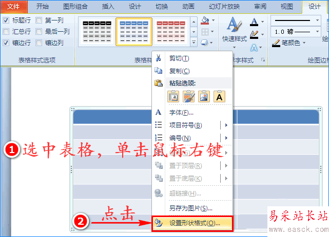2、接著我們選中表格,單擊鼠標(biāo)右鍵,在擴(kuò)展框中選擇“設(shè)置形狀格式”選項,這時會出現(xiàn)對話窗。如圖所示: