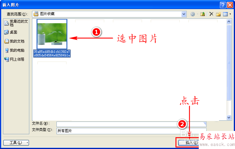 4、緊接著我們點擊擴(kuò)展項中的“文件”按鈕,這時會彈出插入圖片對話窗。選中需做背景的圖片,點擊“插入”按鈕。如圖所示: