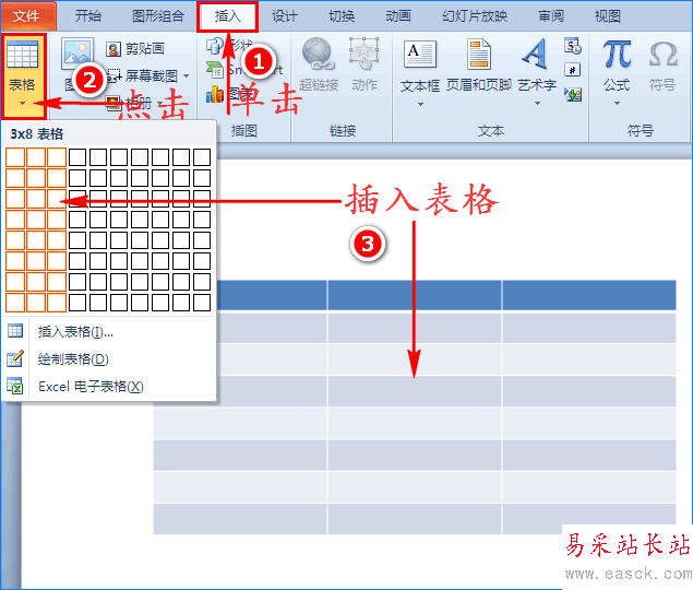 1、打開PPT軟件,我們先在幻燈片中插入自己所需的表格(單擊“插入”菜單,在其子項中點擊“表格”)。如圖所示: