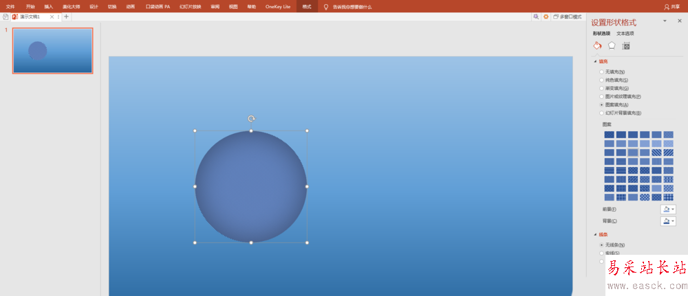 3、設置圓形格式,選擇圖案填充,斜線花紋,填充顏色與背景顏色相近。