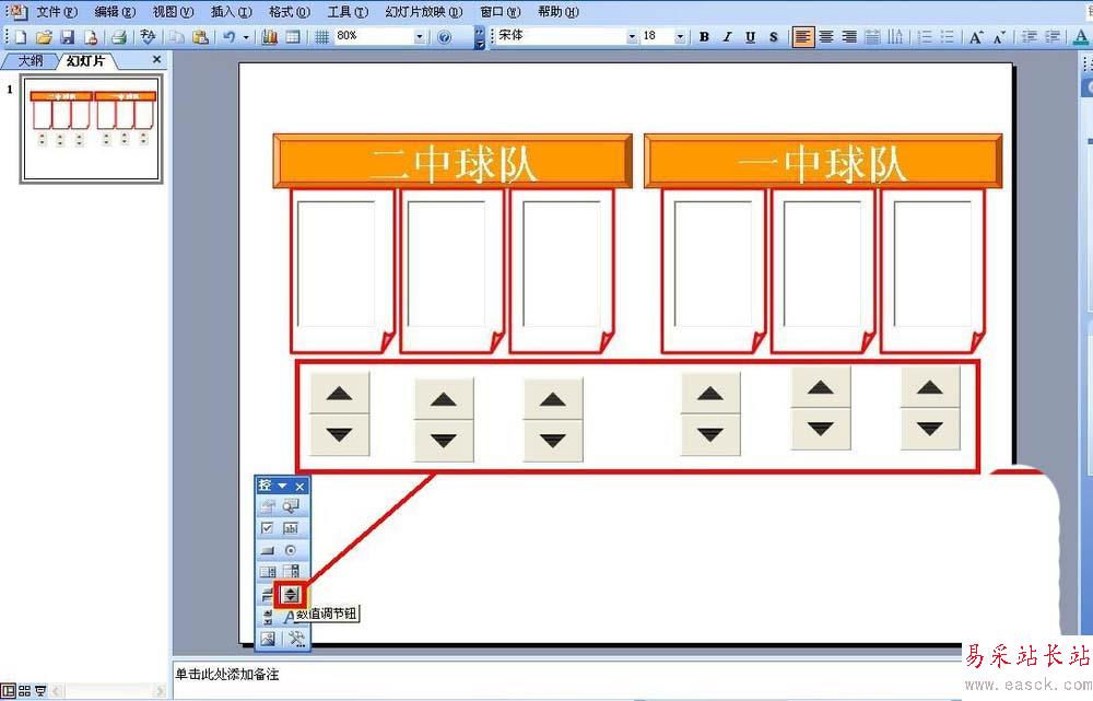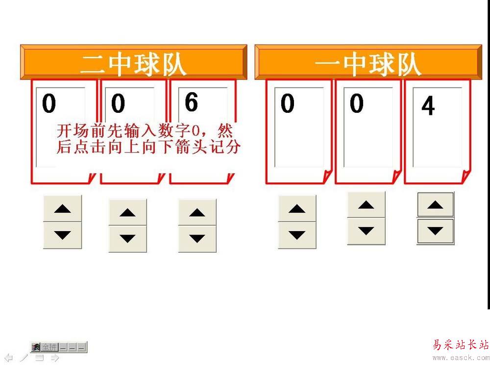 7、最后,按F5觀看放映幻燈片,然后在文本框控件那里全部輸入0,然后就可以點擊上下箭頭自動增減數字了進行記分了。(一定要在文本框輸入數字,數值調節鈕點擊才有效)