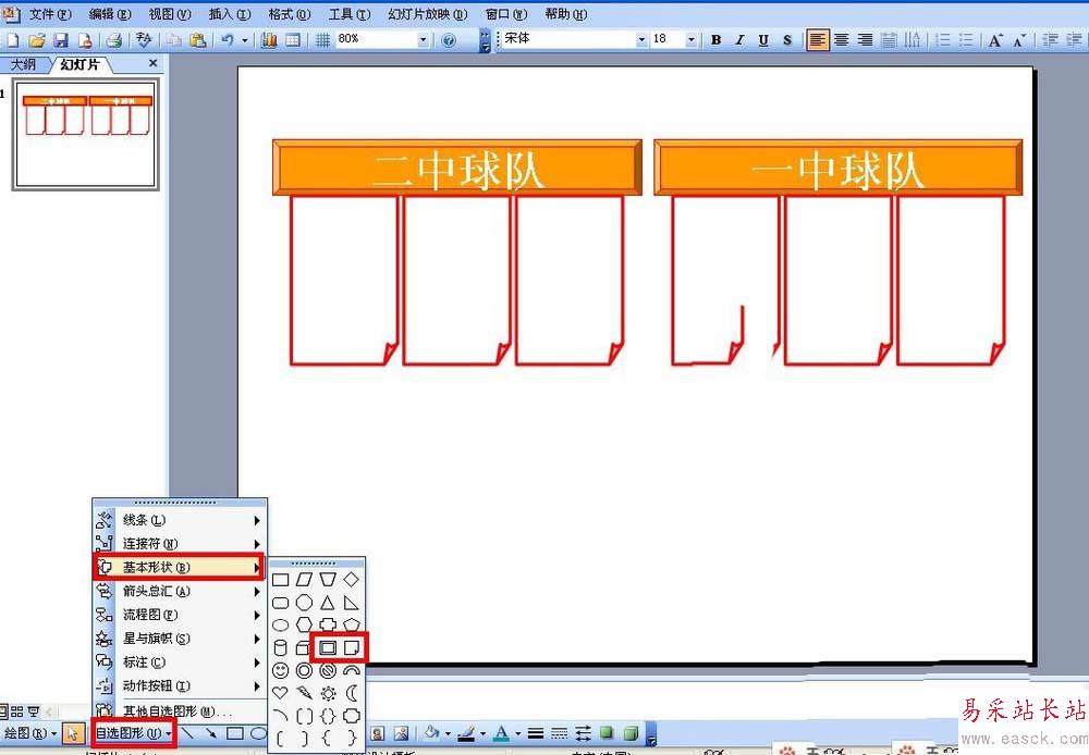 1、小編使用的是PPT2003來制作,在PPT界面點擊左下角的自選圖形選擇棱臺和折角形,在編輯界面那里如下圖畫一個記分牌并調整好大小。然后再在棱臺那里輸入比賽小組名稱并設置字體大小等。