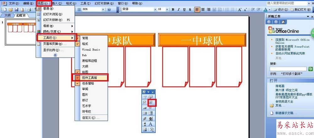 2、點擊視圖——工具欄——點擊勾選控件工具箱——選擇文本框控件放置在步驟一畫好的一個折角形那里。