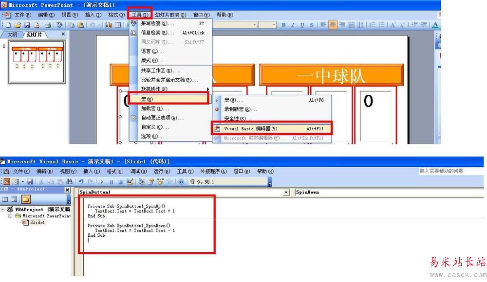 5、設置第一個數值調節鈕VBA代碼。點擊工具——宏——Visua Basic編輯器——然后在編輯器那里輸入如下代碼: