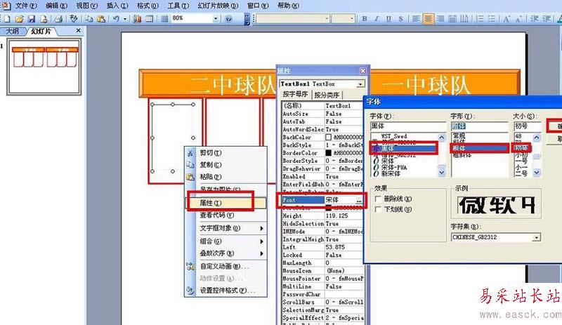 3、右擊文本框控件——選擇屬性——在Font那里點擊宋體旁邊的三點圖標——然后設置好字體、字形和大小等——點擊確定。然后把設置好的文本框控件粘貼到其它的折角形那里。