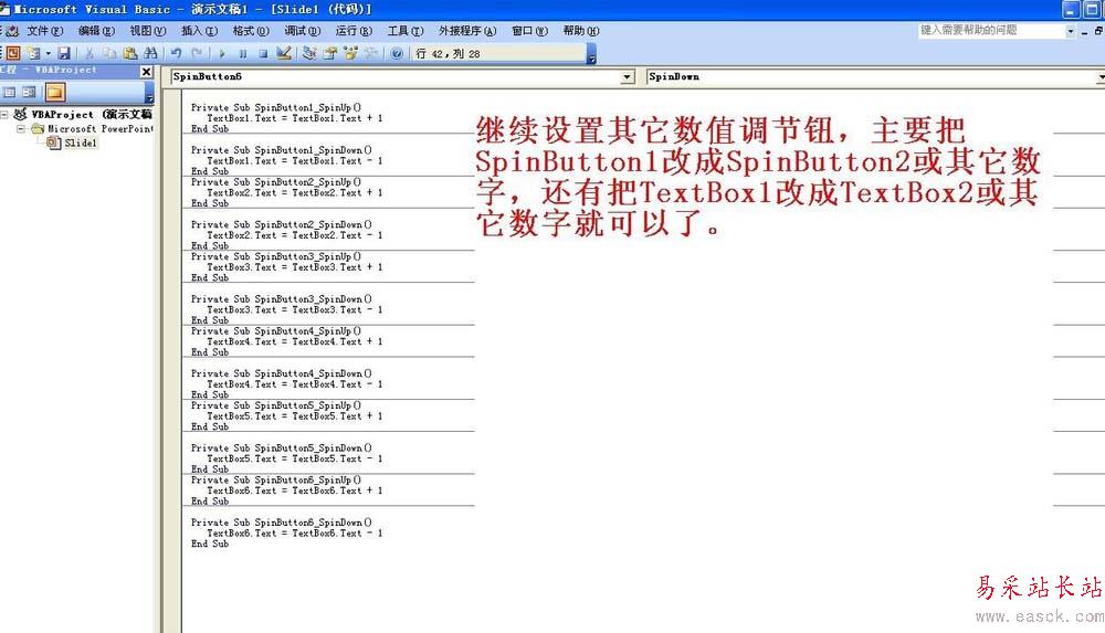 6、按照步驟5的方法設置其它數值調節鈕代碼,主要改動的地方就是把SpinButton1改成SpinButton2或其它數字,還有把TextBox1改成TextBox2或其它數字就可以了。