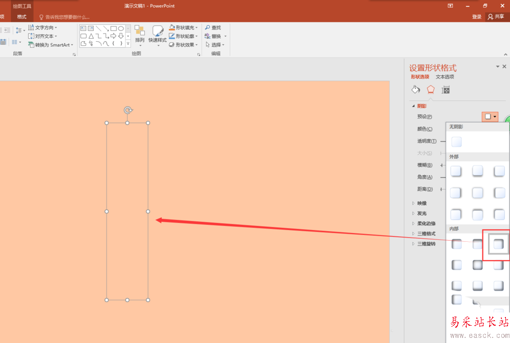 4、選中文本框,打開設置形狀格式窗口,在設置形狀格式中選擇效果中的陰影,然后為其添加一個“內部右上角”的陰影效果。