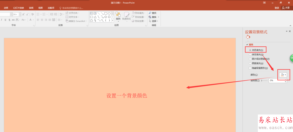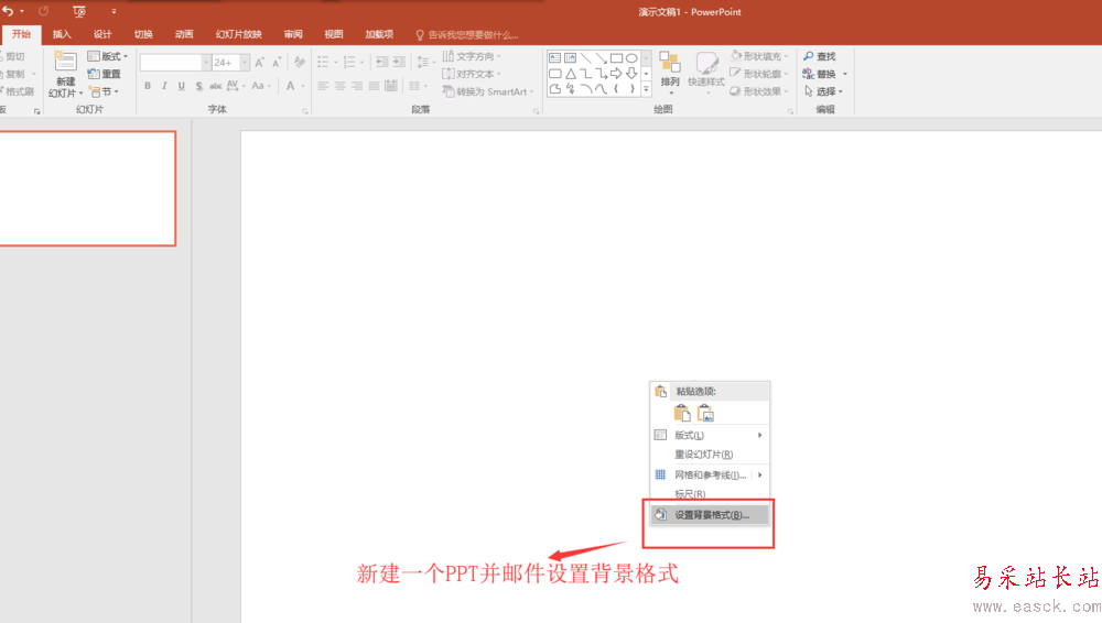 1、打開或創建一個新的PPT,然后在新的PPT的幻燈片上右鍵鼠標,執行設置背景格式命令;然后在打開的設置背景格式窗口中為當前的幻燈片設置一個純色的顏色填充。
