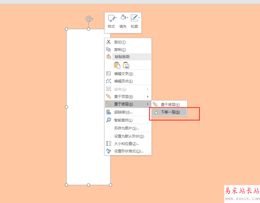 6、選中繪制的這個矩形,右鍵鼠標,執行置于底層中的下移一層;將矩形移到文本框的下方,這樣一個文藝范的空心字效果就出現了。