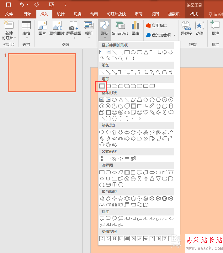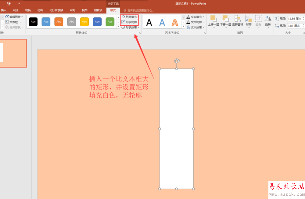 5、在插入菜單中找到形狀命令,在形狀中選擇矩形形狀,然后在幻燈片頁上繪制一個矩形條出來,矩形條的大小要比文本框稍微大一點;并設置該矩形的填充顏色為白色,輪廓顏色為無顏色。